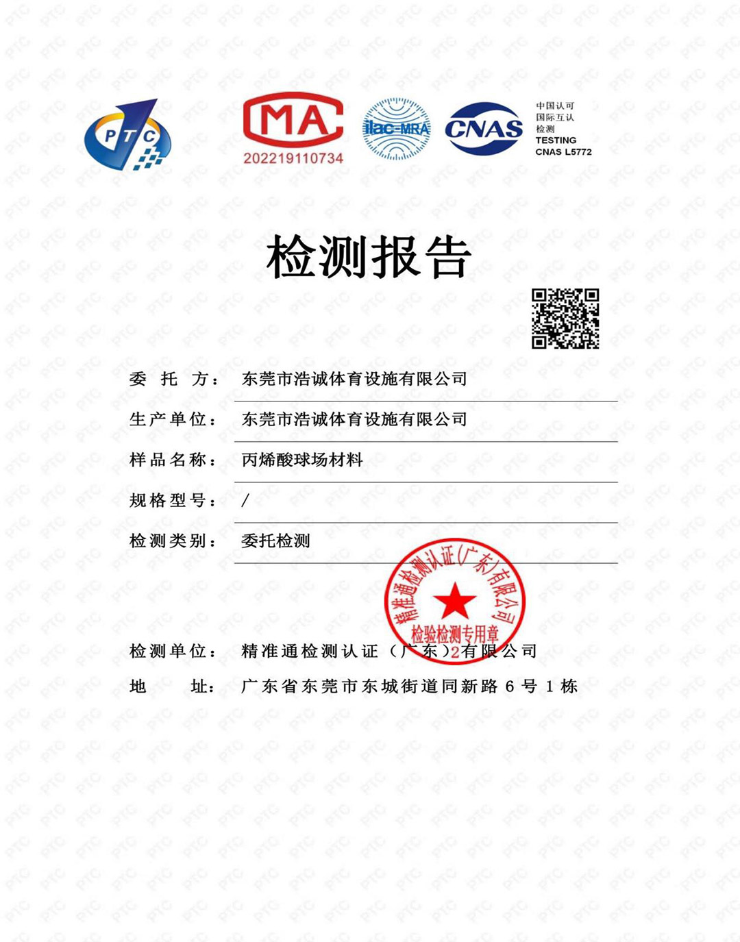 丙烯酸球場材料檢測報告